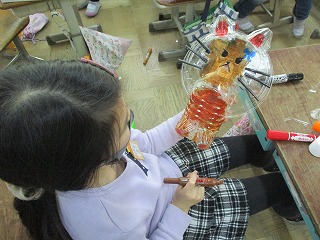 図画工作科「クリスタルアニマル」の学習をしました。ペットボトルや卵パックなどを組み合わせて,色をつけ,中にライトを入れて明かりを灯します。「アニマル」ということで,動物を作りました。みんな,とても素敵な作品ができました。