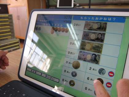 つくし学級にも,タブレット端末が届きました。早速,使い方や約束を確認して自立活動の時間に使いました。今回は,お店屋さんごっこを通してお金の支払い方を学ぶ学習です。