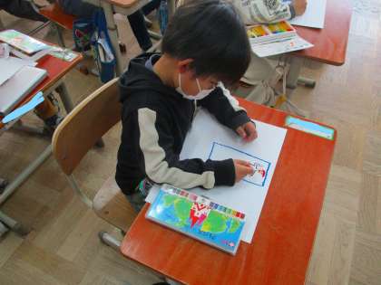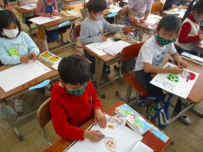 もうすぐ2年生です。今使っている教室は,次の1年生の教室になるので,4月に1年生を迎えるための準備をしています。学校生活の様子が分かるように,一人一枚絵をかきました。教室に掲示する予定です。