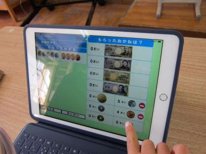 子どもたちは,自分の好きな商品を選んで会計画面に進みます。前回は,硬貨と紙幣の組み合わせを考えてぴったり支払うことをめあてに取り組みました。今回は,そこからレベルアップして,どの紙幣を出せばよいのか,およその数で考えたり,そのお釣りを計算したりしました。友達のお店に行って,買い物をして計算してもらったり,予算と買うものを決めて先生のおつかいに行ったりと,楽しく学習できました。自分で新しく商品を追加したり,値段を変えたりするなど,工夫して取り組むことができています。