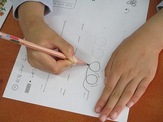 「こしぴん・あしぺた・ぐうひとつ」とよい姿勢の合図を確認して取り組みました。鉛筆も正しく持って書くことができました。
