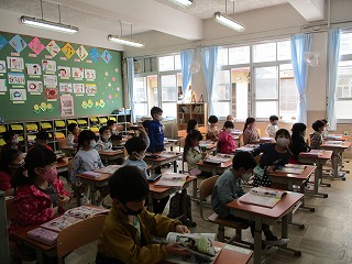 学校にはどんな動物がいるかな?どこにいるかな?あいさつはできるかな?給食当番ができるかな?など,たくさん話し合いをしました。先生の発問に分かったことがあれば,手を挙げて「はい。」と返事をして答えることができました。