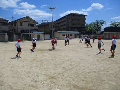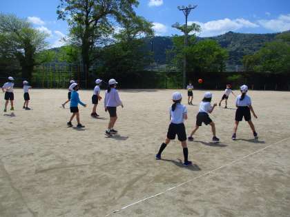 体育では,からだほぐしの運動を学習しています。ストレッチをしたり,みんなで様々なレクリエーションをしたりして,楽しく運動しています。今日は運動場でしっぽとりをしたり,ドッジボールをしたりしました。