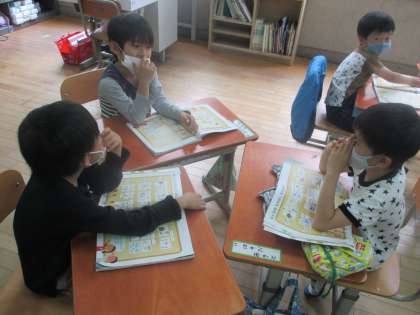 生活科の学習「なかよしいっぱいだいさくせん」では,学校探検の計画を立てました。3,4人のグループに分かれて,グループの名前を決めたり地図を見ながらどこに行くかを話し合って決めました。