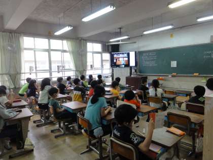 お昼から今年度はじめての児童集会をzoomで行いました。各委員会の代表が自己紹介をしたり,取組を紹介してくれました。教室でも映像をみながら,しっかり拍手で応えていました。