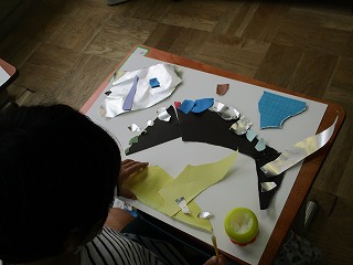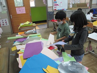図画工作科の学習では,紙をやぶって,やぶった形から,表したいものを考えました。色や手触りを確認しながら使いたい紙を選びました。「この紙とこの紙を組み合わせたら,キリンに見える。」「こうやって置いたら,お花に見える。」など,たくさんの発想があり,楽しんで取り組むことができました。