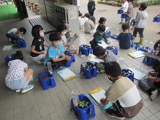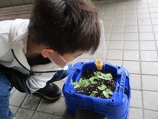あさがおの芽が出てきたので,生活科の学習で,あさがおの観察をしました。「はっぱがちょうちょみたいだな。」「ちょっとざらざらしていたよ。」「くきが赤かったよ。」など,気付いたことがたくさんありました。これから,どのように成長するか楽しみですね。これからもお世話を続けていきましょうね。