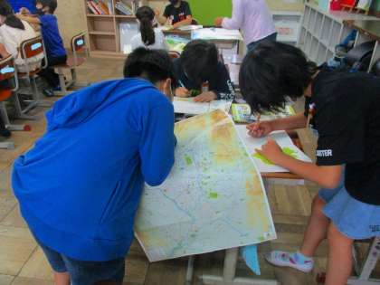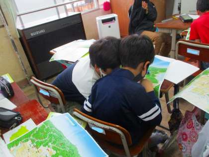 グループで,地図を見たり,地図を見て「じょうすい」「そすい」など水という漢字がつく,分からないことばを辞書で調べたりして予想しました。分からないことや知らないことを,新たに学ぶことは楽しいですね。
