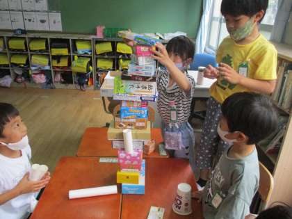 高く積む活動では,どの箱を下に置いたら倒れずに高く積めるか,工夫しながら取り組んでいました。