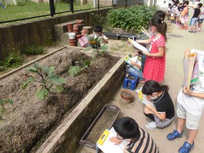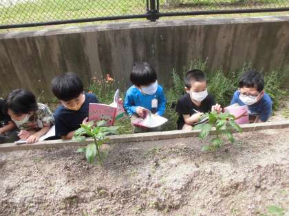 今日は,菜園に植えた,ナス・ピーマンを観察しました。