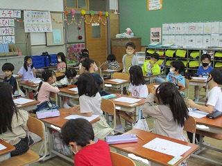 毎日,ひらがなの学習に取り組んでいます。「今日の字は,私のお名前の字だよ。」「ひらがなの学習,とても楽しいな。」など,子どもたちは毎日楽しみにしているようです。今日のひらがなは,「や」です。「や」のつく言葉集めでは,「やぎです。」「やかんです。」など,たくさん手を挙げて発表ができました。聞く子も,発表する子の方を向いて耳をすまして聞くことができました。