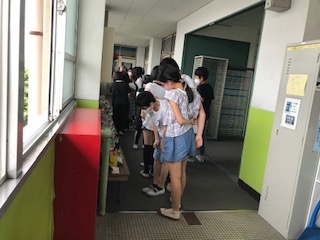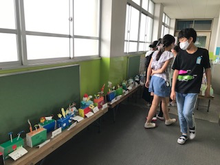 図画工作科「くるくるクランク」を6年生の分を理科室前に並べて,鑑賞会をしました。楽しい作品ができたので,教室に飾るだけでは,なんだかもったいないということで,みんなに見てもらえるように,飾りました。休み時間も興味のある子どもたちは,友達と一緒に観にっていました。