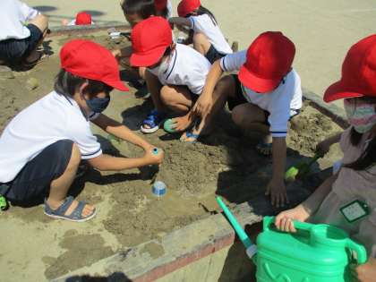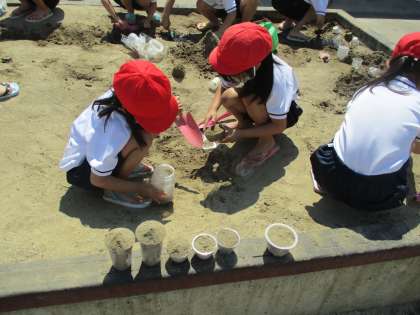 家で集めて持って来たゼリーやプリンのカップ,プラスチックのコップなどを使って好きなものを作りました。子どもたちは砂や泥でケーキやだんごを作ったり,川や山を大きくしてつなげたりして友達と協力しながら取り組んでいました。