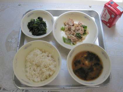 麦ごはん・牛乳・豚肉と万願寺とうがらしのいためもの・ほうれん草のおかか煮・みょうがのみそ汁 です。