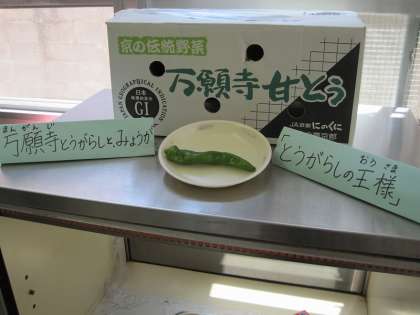 万願寺とうがらしは,京都で作られている京野菜です。形が大きく,ほんのり甘みがあるのが特徴です。給食室には,とても大きくてつやのあるものが届きました。