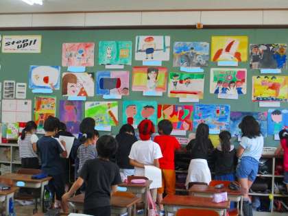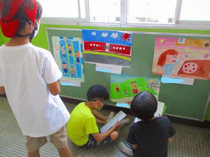 図画工作で「忘れられない気持ち」をテーマに絵をかきました。今までの心に残っている思い出,そのときの気持ちを表すために,色,形,人物の表情,動きなどに気をつけてかきました。今日は,出来上がった絵をみんなで鑑賞しました。友達の作品のすてきなところがたくさん見つかりました。