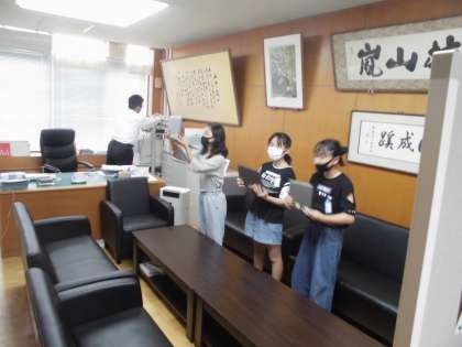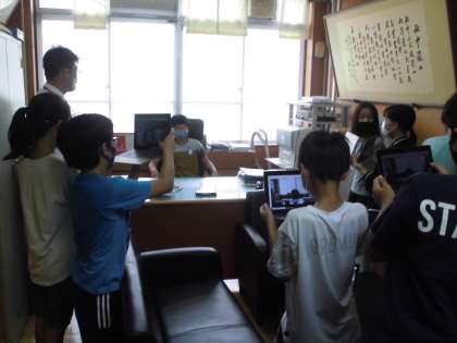 なんと,撮影をしていると,校長先生が「是非,校長室もどうぞ。」と声をかけてくださいました。子どもたちは大喜びです。中に入らせていただいたのは,5年前「学校探検」をしたとき以来でしょうか。椅子に座らせてもらったり,いろいろな角度から写真を撮らせていただきました。校長先生,ありがとうございます。