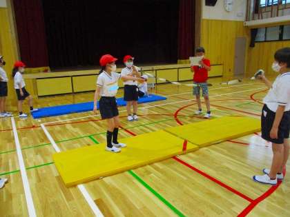 体育科で「マット運動」を学習しています。ねらい1では,できる技を連続してできるよう練習しています。ねらい2では,少しがんばればできそうな技を練習しています。友達同士で技を見せ合いながら,練習を進めています。