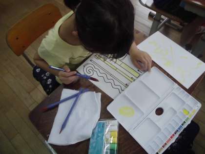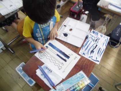 2年生になって子どもたちが楽しみにしていた学習の一つで,朝から絵の具セットを持ってウキウキしながら登校する様子が見られました。最初に用具の名前や使い方をたしかめ,いよいよ絵の具を使って色をつけていきます。絵の具の量や水の量によって,筆の滑り方や色の見え方に違いが出ることに気付きました。