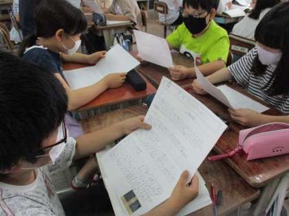 国語では,みんなが過ごしやすい町になる工夫を見つけ,点字や点字ブロック,盲導犬などについて調べて,報告する文章を書きました。グループで読み合って,「写真があって,とてもわかりやすかったです。」「引用したところがわかりやすく書けていてよかったと思います。」など,感想を伝え合っていました。