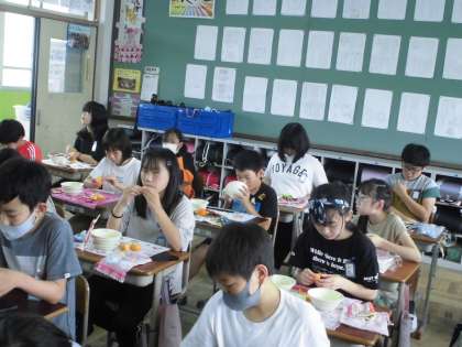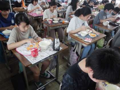 今日の給食には「冷凍みかん」が登場しました。今日は曇り模様で少し涼しかったので,もう少し暑い日に食べたかった・・・という声も聞こえてきました。氷がついていて,中はシャキシャキしていて,少し冷たかったですね。でもおいしかったです。