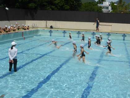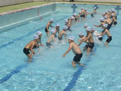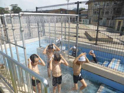 着替えの仕方や,移動の仕方,プールに入る前の準備など一つ一つを確認し,激しく水しぶきを上げるシャワーへ突入です。その後,プールサイドに並び,ついにプールの中へ入ります。朝から30度近い気温の中,プールの中で気持ちよく水慣れの活動をしました。