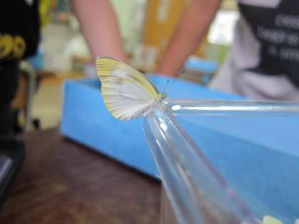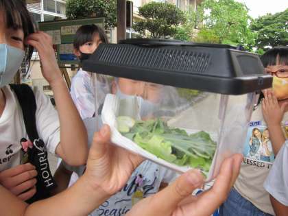 教室でお世話をしていたモンシロチョウの幼虫がさなぎになって1週間が経ちました。そして今日、はじめてモンシロチョウか羽化しました。クラスで話し合い、このまま虫かごの中にいると羽が傷んでしまうということで、中庭に放しました。ひらひらと飛んでいくモンシロチョウに「元気でね!」、「またね!」と声をかけて見送りました。今日は2羽が羽化しました。これからが楽しみです。