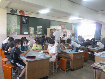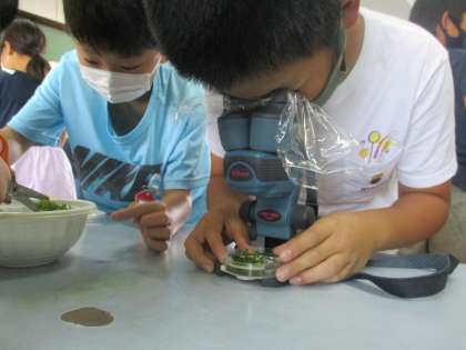 理科の学習で,そう眼顕微鏡を使ってメダカのたまごを見ました。水草についているたまごを見つけて,たまごの大きさや形などじっくり見ていました。これからどのように様子が変わっていくのか,楽しみですね。