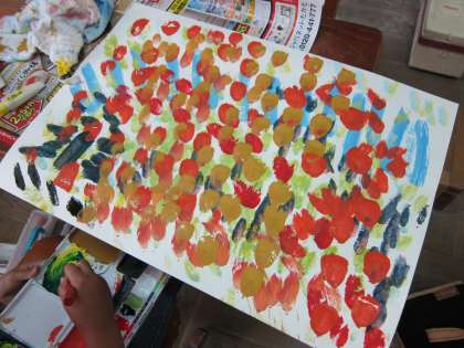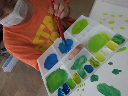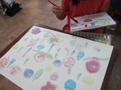 図画工作の時間に、わたしの6月の絵を描きました。6月の風景を写真に撮り、それを見ながら、6月の色や形のイメージをふくらましました。絵の具を混ぜて6月の色を作りを工夫したり、水の量を変えて濃淡をつけたりしました。それぞれに、すてきな自分の「6月」を表現していました。