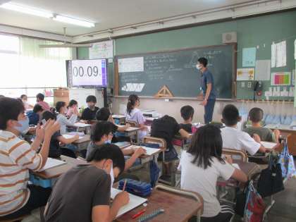 算数科では,三角形の3つの角について考えました。三角形の角をすべて合わせると180度になることを知り,そのきまりを使って,わからない角の大きさを求めることができました。