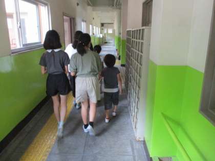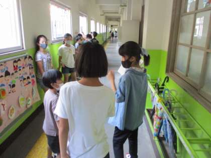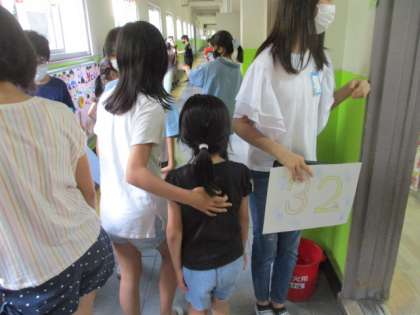 初めてのスマイル活動です。リーダーデビューは,まず1年生のお迎えです。そして,スマイルグループの教室で自己紹介して楽しく遊びます。1年生に迎えに行くとき,6年生は担任の先生に「〇〇ちゃん(さん),いますか?」と聞いて,一緒に歩いてスマイルグループの教室に向かいました。