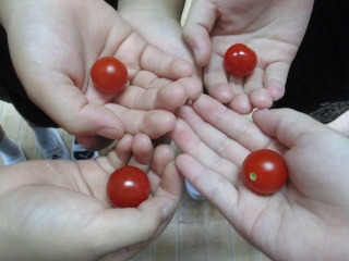 生活科で育てているミニトマト。子ども達は毎朝水やりを頑張っています。今朝,登校してきた子ども達が,「ミニトマトの実が赤くなってる!」「食べたらおいしそう!」と,とてもうれしそうに報告しに来てくれました。そこで,みんなで赤くなったミニトマトの実を収穫しました。