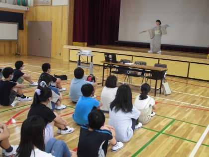 今日の2・3校時に,伝統芸能体験として日本舞踊の先生お二人に来校いただき,日本舞踊の歴史を教えていただいたり,実際に踊りを見せていただいたりしました。