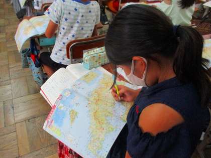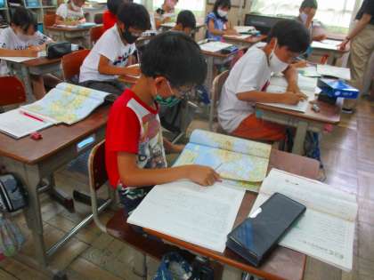 (写真は国語科「カンジ—博士の都道府県の旅(2)」を学習している様子です。)