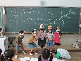 国語科の学習では,おおきなかぶの音読発表会をしました。それぞれの役になりきって,練習に取り組みました。本来の台詞にない言葉を考えてつけ加えたり,動作を考えて,楽しい発表会になりました。聞いている友達からは,「○○さんの演技は.本当のおじいさんみたいですごかったです。」「みんなの声がそろってて,かぶが抜けた時のうれしい気持ちが分かりました。」など,良いところを見つけることができました。