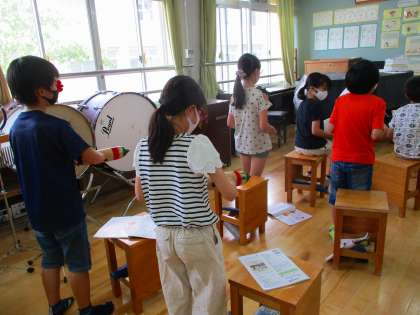音楽で「いろんな木の実」という曲を学習しました。ギロ,マラカス,クラベスを使って,曲に合わせて演奏しました。リズムを感じながら演奏することに気をつけました。