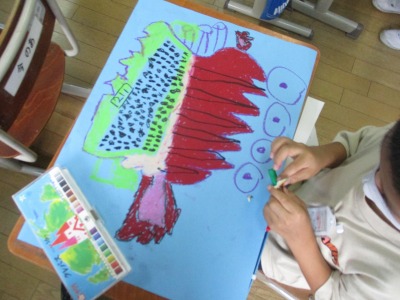 5時間目の図工の学習では,お話の絵を描きました。子ども達は,パスを使ってメインになるものを丁寧に描いていました。授業の終わりには,「あと少しで完成です!」と嬉しそうな顔で見せに来てくれる人がたくさんいました。完成が楽しみです。