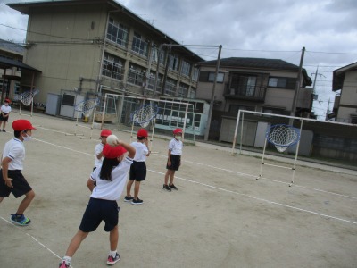 体育科で投げ遊びの学習をしました。今日は,狙ったところにボールを投げることをめあてにし,ゴールに向かってボールを投げました。子ども達は少しずつ,ゴールとの距離を伸ばして,投げていました。山なりの柔らかいボールを投げれるよう頑張っています。