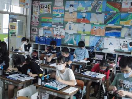 ぽたっと落ちた墨,すうっとにじんだ形。社会科でも,雪舟が広めた水墨画について学びました。今日は,水墨画を実際に自分たちでトライしました。水の量を変化させたり,墨の濃淡を生かして表現を楽しみました。学習の後には,「雪舟ってすごいね。」「墨だけで絵を描くって難しい。」という意見がでてきました。また明日,総合でも振り返り,日本の伝統文化について考えをまとめていきましょう。