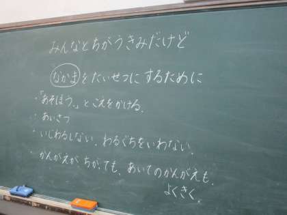 水曜日,全校集会がありました。校長先生からは,「なかまを大切にすること」についてお話がありました。そのあと,「みんなとちがうきみだけど」という絵本の読み聞かせを聞きました。周りの人や外国の人と仲良くなるために大切なことを考えました。子どもたちからは,「自分からあいさつをしたらいい。」「自分が言われてうれしいことを言えばいい。」「相手の意見も受け入れる。」などいろいろな考えが出ました。しっかりと考える姿が見られて,うれしかったです。