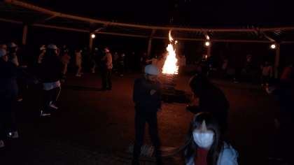 キャンプファイヤーが始まりました。炎を中心にそでふれを踊っています。