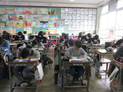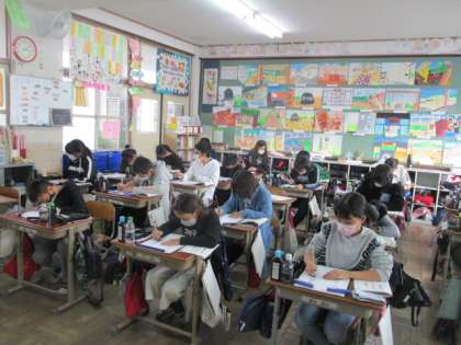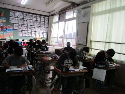 この日は,小筆を使って短い言葉を書きました。漢字は大きく,ひらがなは少し小さめに描きます。配列や文字のつながりに気をつけて書きました。筆の穂先の動かし方が難しかったそうです。