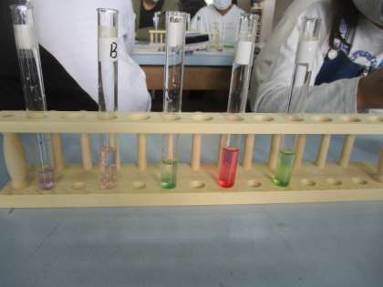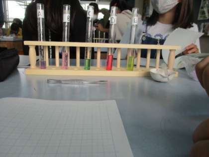紫キャベツの濃い紫が,液性によって色がふわりと変わるので,みんなびっくりしていました。どの試験管が何性かわかるかな?