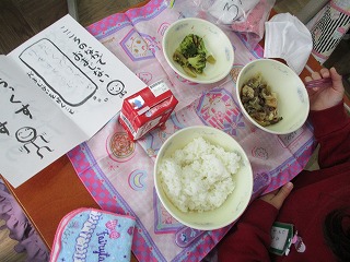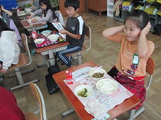 栄養教諭の先生の学習があった今日の給食の時間には,「いただきます。」の後,「まほうのたべかたカード」を出して,自分が書いたことをチェックする子がたくさんいました。「もぐもぐすると,音がするよ。」「いつも苦手なものでも,ご飯と一緒に食べたら,なんだかおいしく感じるよ。」など,気付くことがたくさんあったようです。今日も,全員完食することができました。