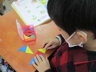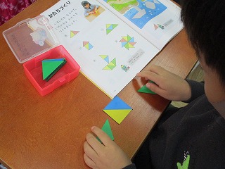 算数科の学習では,「かたちづくり」の学習をしています。図を見ながら,色板を並べて,形を作りました。お手本をよく見ながら,形を作ることができました。