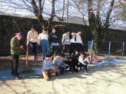 よい,秋晴れの下で写真撮影をすることができました。グループでの撮影は,思い出に残っている場所を選びました。鉄棒,バスケットコート,運動場,総合遊具,校門前,中庭・・・思い出がたくさんつまっていますね。