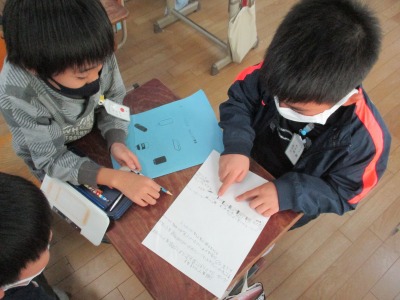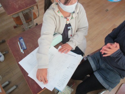 生活科の学習で,「あそんで ためして くふうして」の学習をしました。自分のおもちゃを使ったゲームを作るために,点数やルールを考えました。子どもたちは,友達と相談しながら「1年生には簡単なものにしてあげよう。」「大人の人や年上の人には少し難しいものもいるのかな。」などど,いろいろな人が楽しむことが出来るような工夫を沢山考えていました。
