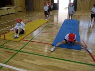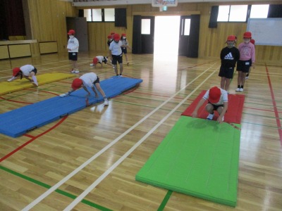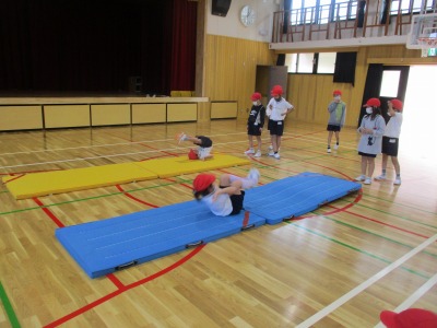 体育科の学習で,マット運動をしました。今日は,前転に加えて,開脚前転と後転に挑戦しました。子ども達は,手をつく位置や足の開き方などを沢山練習していました。上手にできている人をお手本にして,きれいに技を決められるよう,頑張っています。