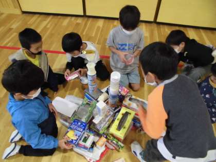 先週,図画工作科の学習「いっぱいつかってなにしよう」では,集めた箱やカップを使っていろいろなものを作りました。今回は広い体育館で学習を行ったので,子どもたちは大喜び!友達と協力しながらたくさん集めた材料を並べたり積んだりして,お城やおうちの部屋,ドミノなどさまざまなものを作っていました。振り返りでは「みんなで作って楽しかった!」「みんなで力を合わせて作るのはいいなと思った!」などたくさんの感想が出ていました。子どもたちの楽しかった気持ちが伝わってきました。