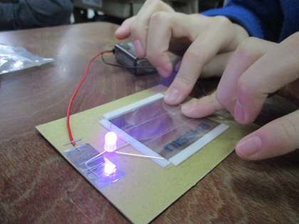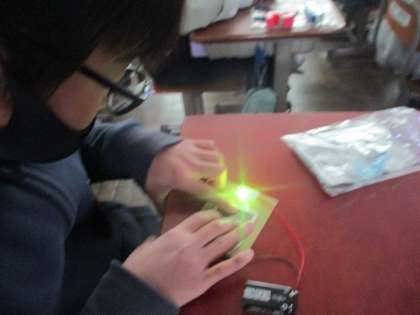 一生懸命製作に取り組み,見事完成しました!「さわる場所が違うと光る色が変わる!」「同時に触ったら,色が混ざった!」など,不思議なタッチパネルの完成に喜んでいました。